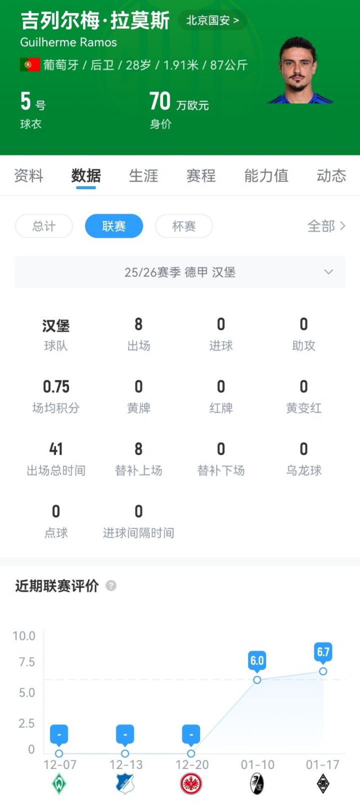 吉列尔梅·拉莫斯曾效用葡萄牙体育、比勒菲尔德等队,2023年加盟汉堡,本赛季代表球队出战8场德甲策画41分钟,他的德回身价为70万欧。 据此前音书,在俱乐部新任体育总司理马永明主导下,国安筹划在本年补充3名附近的新外助。在古加剧返葡超、恩加德乌离队的布景下,国安新赛季证据留用的外助当今有时尚法比奥、中场达万。 至于前塞尔维亚国脚中卫斯帕吉奇,他与俱乐部的条约时将于2027年底到期。不外,球员因伤缺席了2025赛季后半段的通盘比赛,当今斯帕吉奇的躯壳情景总体趋好,有望在新赛季中超开赛前康复。