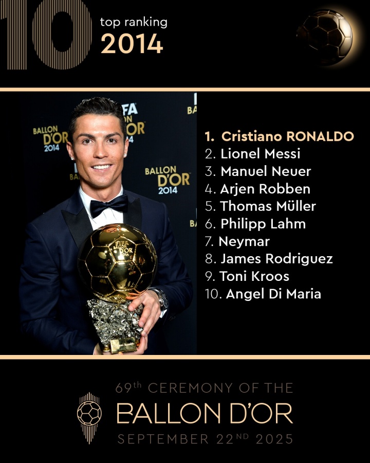 08月23日讯 金球奖官方不时每天一期盘货往届金球得主,预热一个月后的2025金球受奖庆典,今天来到了2014年。2014年C罗获取了我方活命的第3座金球奖,梅西、诺伊尔排行前三。 2014年金球奖前10: 1:C罗 2:梅西 3:诺伊尔 4:罗本 5:穆勒 6:拉姆 7:内马尔 8:J罗 9:克罗斯 10:迪马利亚 |