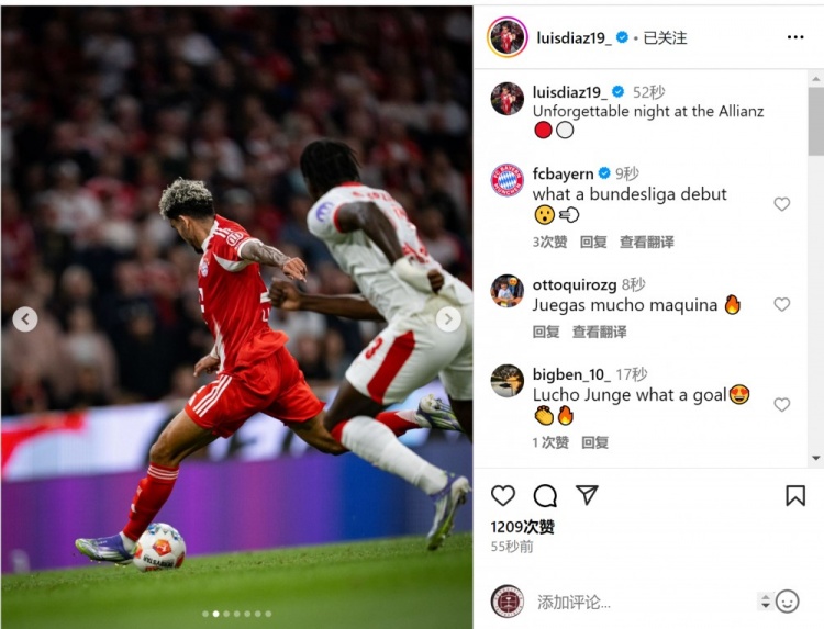 8月23日讯 德甲首轮比赛,迪亚斯1射2传,匡助拜仁主场6-0打败莱比锡。 迪亚斯社媒晒出比赛像片,配文:“安联球场的铭刻夜晚。” |