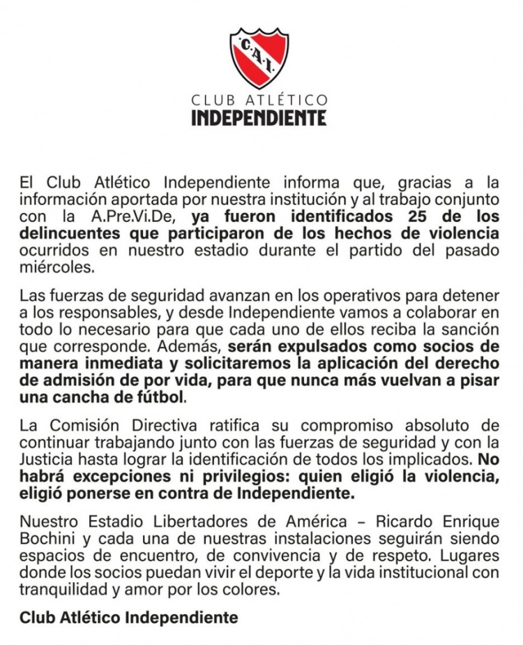 8月26日讯 今天,独处竞技俱乐部针对在上周南好意思洲杯1/8决赛中发生的球场讲和事件发布公告,明确示意对参与该事件的主场球迷赐与重办。 在南好意思洲杯1/8决赛中,阿根廷独处球迷与智利大学球迷发生突破,突破随后升级为恶性讲和事件。这次事件形成了严重的东谈主员与顺次絮叨。据统计,事件共导致100余东谈主被警方逮捕,19东谈主在突破中受伤,其中两东谈主伤势严重。 独处竞技俱乐部官方公告: “通过本俱乐部提供的信息以及与A.Pre.Vi.De的共同费力,咱们还是说明了25名参与上周三比赛手艺在咱们通顺场发生的暴力事件的积恶分子。” “安一谈门正在遴荐行动逮捕这些牵累东谈主,而独处竞技俱乐部将全力配合,确保每个东谈主受到应有的不休。此外,这些东谈主将立即被取消会员经历,并央求弥远不容他们干与足球场。” “董事会重申,咱们将连续与安一谈门和国法部门勾通,直到通盘涉案东谈主员齐被识别出来。莫得例外也莫得特权:弃取暴力的东谈主等于弃取了站在独处竞技俱乐部的对立面。” “咱们的通顺场以及每一个步履将连续行为约会、共处和尊重的空间。在这里,会员们不错释怀地享受体育和俱乐部生存,可爱咱们的球队。” |