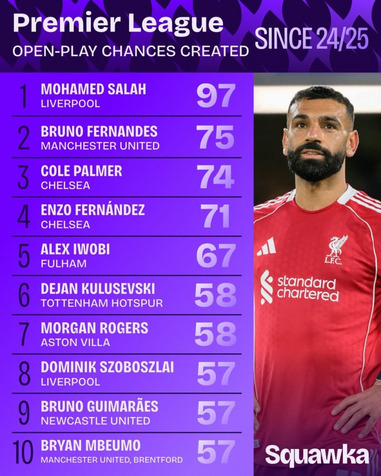 10月16日讯 日前,Squawka统计了英超畅通战创造契机次数排名,萨拉赫居首,B费、帕尔默分居二三位。 1、萨拉赫(利物浦):97次 2、B费(曼联):75次 3、帕尔默(切尔西):74次 4、恩佐(切尔西):71次 5、伊沃比(富勒姆):67次 6、库卢塞夫斯基(热刺):58次 7、摩根-罗杰斯(维拉):58次 8、索博斯洛伊(利物浦):57次 9、吉马良斯(纽卡):57次 10、姆伯莫(曼联/布伦特福德):57次 |