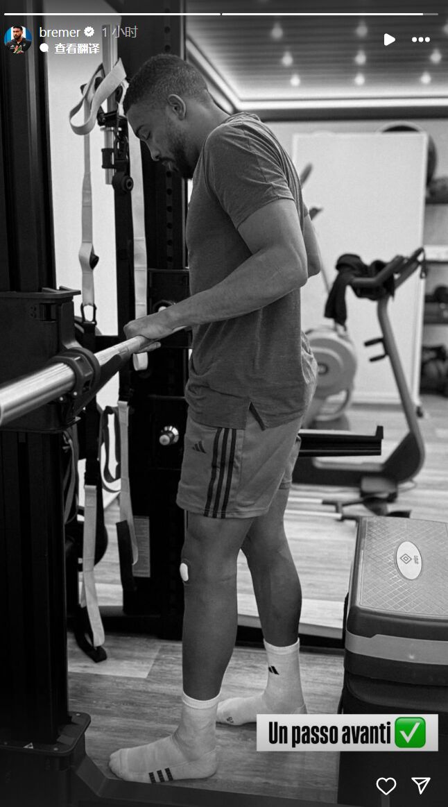 10月18日讯 尤文后卫布雷默此前已告成给与左膝半月板手术,预测将缺阵约六周技艺。 布雷默社媒晒图:身处健身房,正在进行还原性老练。相片的右下角配特意大利语翰墨“Un passo avanti”,意为“上前一步”。 |