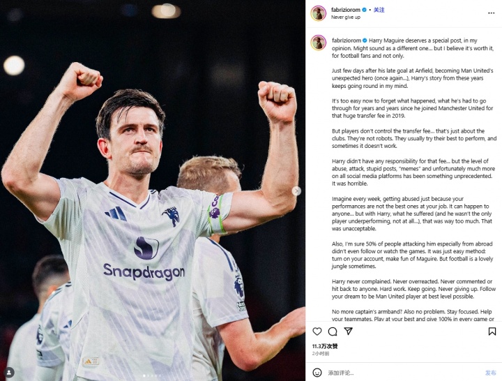 10月22日讯 英超第8轮,马奎尔8次突围还孝顺致胜头球,匡助曼联2-1打败利物浦。 名记罗马诺本日发布长文(十分荒废)为马奎尔发声: 在我看来,马奎尔值得单独撰文。这大致显得有些至极……但我信托这值得,不仅对足球迷如斯。 就在他于安菲尔德球场打入制胜球、再度成为曼联骁雄的几天后,马奎尔这些年的故事仍在我的脑海中萦绕。 如今东说念主们太容易淡忘——自2019年以天价转会费加盟曼联以来,马奎尔这些年阅历了若干灾荒。 但球员无法掌控转会费……这自便是俱乐部的决定。球员不是机器东说念主。他们经常会用逸待劳拿出弘扬,可无意却事与愿违。 这笔转会费与马奎尔毫无联系……但酬酢媒体上劈头盖脸的曲直、抨击、愚蠢的帖子、梗图,以及更恶劣的言行,其领域前所未有。几乎不胜入目。 试思每周齐因弘扬欠佳遭遇曲直。这种事可能发生在职何东说念主身上……但马奎尔承受的诟谇(他绝非惟一状况低迷的球员)果真过分。这全齐不成接纳。 而况我驯服50%抨击他的国际网友根本没看过比赛。他们仅仅翻开账号,对马奎尔冷嘲热讽。 但足球寰球无意会充满爱意。马奎尔从不挟恨,从不外度反馈,从不回答任何东说念主。尽力熟悉,不到乌江不竭顶,永不言弃。跟班梦思,以最好状况成为别称曼联球员。 失去队长袖标?不进军。保抓专注,协助队友,每场比赛、每堂熟悉课好意思满力以赴施展最好水平。 马奎尔依然不是别称晦气的球员,如今他也不是金球奖得主。关节在于那些本领——无论是足球、体育照旧糊口。这是一个适用于通盘球迷、球员,以过火他畅通爱好者乃至平方东说念主的故事。 在安菲尔德进球后,马奎尔说:“我相等爽脆,因为我多年来一直适当着这家俱乐部……也因为这一天,咱们的球迷不错感到爽脆。他们值得这一切。” 让别东说念主说去吧,让别东说念主月旦去吧。不要毁灭你的梦思。愈加尽力地职责。付出你最大的尽力……然后好意思好的事情就会到来。 |