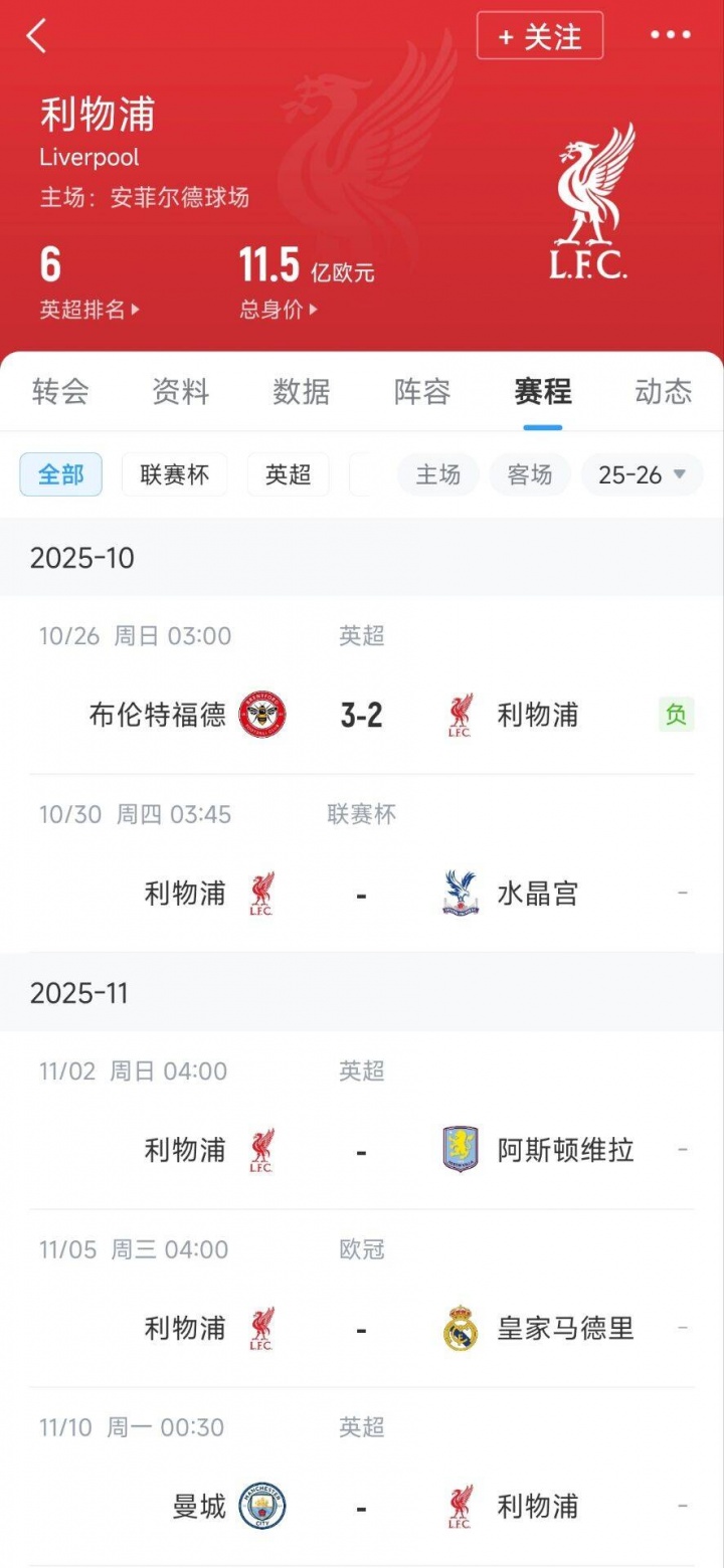 10月26日讯 英超第9轮利物浦2-3不敌布伦特福德,碰到英超四连败。 然则来不足颐养现象,利物浦接下来的赛程依旧不吉。他们将不才周中联赛杯对阵强敌水晶宫,随后的两轮英超维拉和曼城将带来挑战。而在这技巧,欧冠赛场上赤军还将迎战西甲权门皇马。