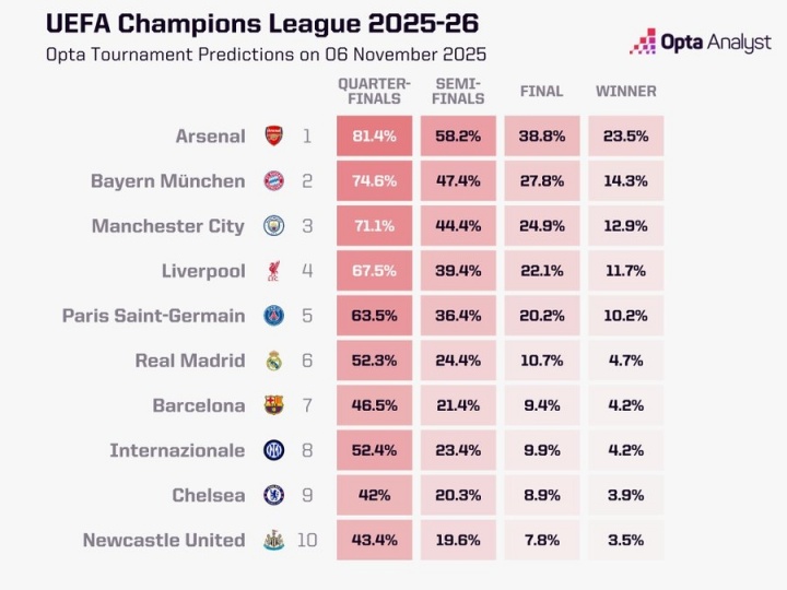 11月06日讯 欧冠联赛阶段第4轮的比赛如故一齐罢休,OPTA超算更新了欧冠夺冠概率。 最新的欧冠夺冠概率: 1、阿森纳:23.53% 2、拜仁:14.33% 3、曼城:12.95% 4、利物浦:11.72% 5、巴黎:10.22% 6、皇马:4.7% 7、巴萨:4.24% 8、国米:4.19% 9、切尔西:3.85% 10、纽卡:3.49% 11、多特:1.38% 12、热刺、马竞:1.28% 13、亚特兰大:0.44% 14、加拉塔萨雷:0.43% 15、那不勒斯:0.38% 16、勒沃库森:0.36% 17、葡萄牙体育:0.30% 18、布鲁日:0.26% 19、尤文:0.20% 20、埃因霍温:0.15% 21、摩纳哥:0.08% 22、马赛:0.07% 23、本菲卡:0.05% 24、法兰克福、圣吉罗斯:0.04% 25、卡拉巴赫、帕福斯、奥林匹亚科斯、比利亚雷亚尔:0.01% 26、毕尔巴鄂竞技、布拉格斯拉维亚、哥本哈根、博德醒目、阿贾克斯、阿拉木图凯拉特:0%
