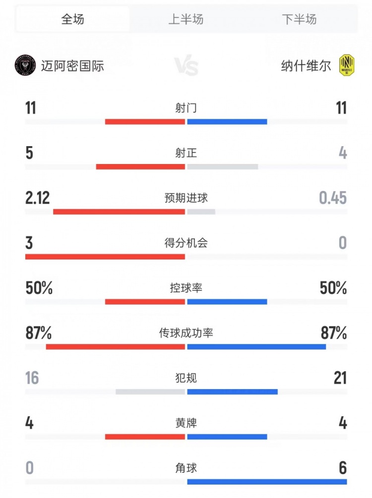 11月9日讯 好意思职联季后赛首轮第三场比赛,迈阿密海外主场4-0打败纳什维尔,两胜一负晋级下一轮。 迈阿密海外vs纳什维尔全场数据: 射门——11比11 射正——5比4 预期进球——2.12比0.45 得分契机——3比0 控球率——50%比50% 传球得手率——87%比87% 犯规——16比21 黄牌——4比4 角球——0比6 |