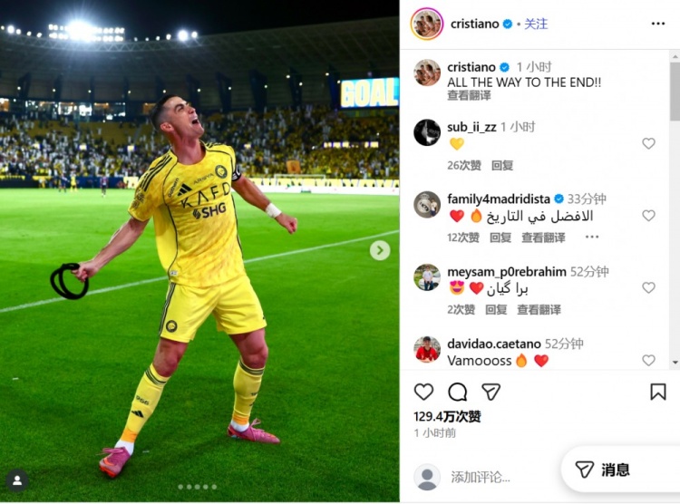 11月2日讯 沙特联第7轮比赛,利雅得生效在主场以2-1的比分逆转礼服费哈。本场比赛,主队40岁宿将C罗梅开二度,推崇拉风。 赛后,C罗在酬酢媒体上晒出了我方的...