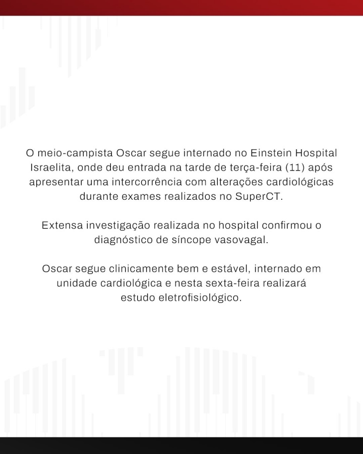 11月14日讯 圣保罗俱乐部官方发布公告,就34岁奥斯卡此前体检时昏迷、腹黑检查极端一事作念出公告。 公告实质: 中场球员奥斯卡现在仍在入院,他于周二下昼因在C...