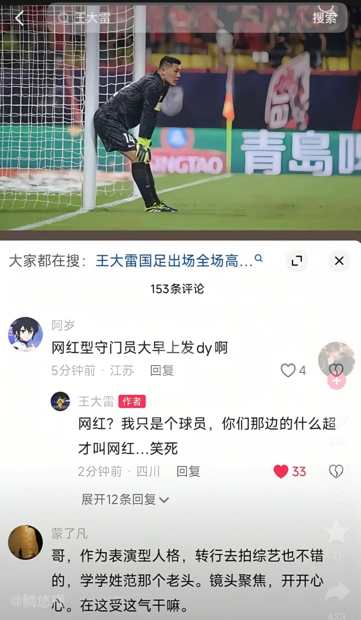 08月03日讯 日前,王大雷社媒晒比赛照被一IP属地“江苏”的网友评述是“网红型守门员”,王大雷随后进行回怼,当今该条动态已被王大雷删除。 该网友评述:“守门员大早上发dy啊”。王大雷随后回话:“网红?我仅仅个球员,你们那处的什么超才叫网红...笑死”。 昨日中超第19轮泰山1-2不敌蓉城的比赛中,王大雷禁区外犯规放倒费利佩被直红罚下。 |
