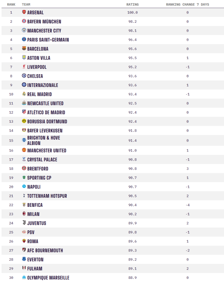 虎扑12月31日讯驰名统计机构OPTA更新了最新的公共俱乐部的名次,阿森纳连接以满分排在榜首,拜仁、曼城分列二三位,阿斯顿维拉反超利物浦升至第六,皇家马德里的落到了第十位。 以下是OPTA俱乐部名次前十: 1.阿森纳 2.拜仁慕尼黑 3.曼城 4.巴黎 5.巴塞罗那 6.阿斯顿维拉 7.利物浦 8.切尔西 9.外洋米兰 10.皇家马德里