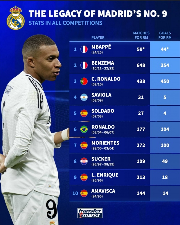 8月9日讯 皇马官方文告,恩德里克将身穿9号球衣,德国转会阛阓盘货了皇马近10位9号球员。 德转盘货皇马近10位9号球员: 姆巴佩(24/25)——59场44球 本泽马(10/11-22/23)——648场354球 C罗(09/10)——438场450球 萨维奥拉(08/09)——31场5球 索尔达多(07/08)——27场4球 罗纳尔多(03/04 – 06/07)——177场104球 莫伦特斯(99/00 – 03/04)——272场100球 苏克(96/97 – 98/99)——109场49球 路易斯-恩里克(95/96)——213场18球 阿马维斯卡(94/95)——144场14球 注:出场指皇马糊口所有比赛,并非身穿9号的出场次数 |