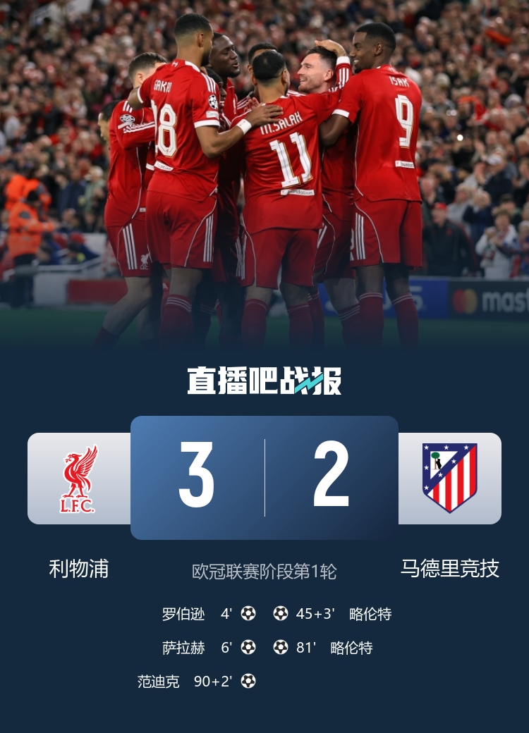 09月18日讯 欧冠第一轮,利物浦3-2畏俱绝杀马竞,获得欧冠开门红。利物浦,再一次绝杀! 利物浦开季以来,联赛+欧冠5场4次绝杀!另外1场83分钟忠良球制胜!
