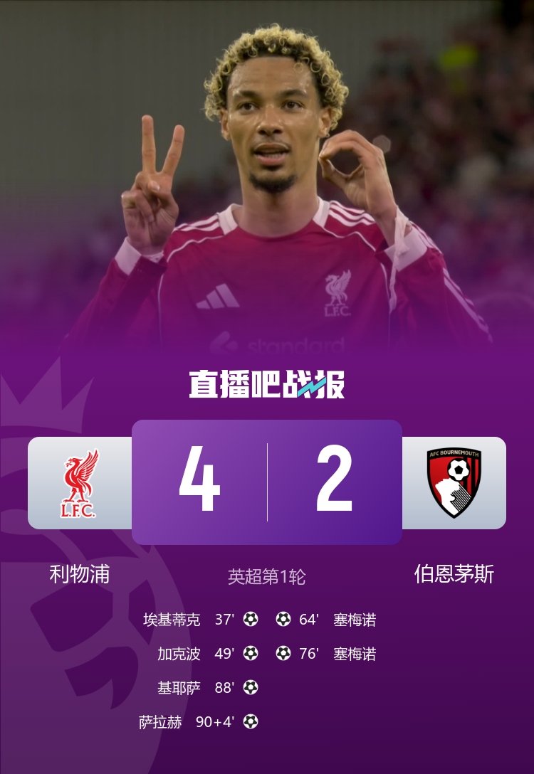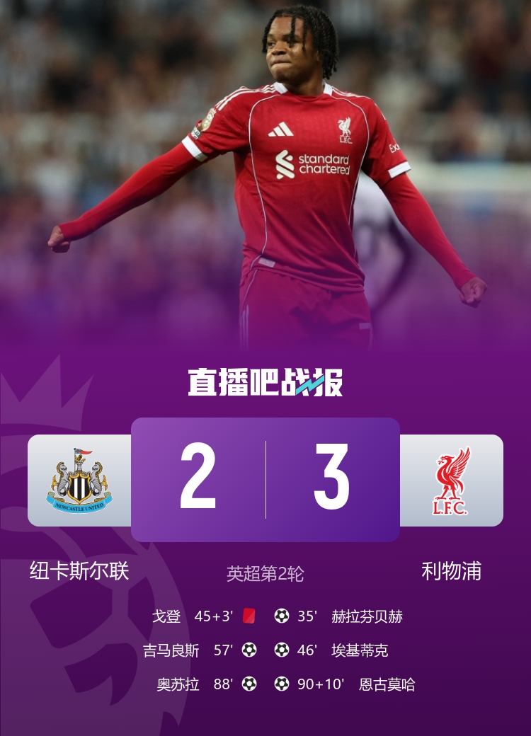 此前英超四轮比赛,利物浦3场绝杀,1场是83分钟忠良球制胜。 英超第1轮,利物浦4-2伯恩茅斯,基耶萨88分钟绝杀,萨拉赫94分钟锁定胜局! 英超第2轮,纽卡斯尔2-3利物浦!恩古莫哈100分钟绝杀! 英超第3轮,利物浦1-0阿森纳!索博斯洛伊83分钟随便球寰宇波制胜! 英超第4轮,伯恩利0-1利物浦!萨拉赫95分钟点球绝杀!
