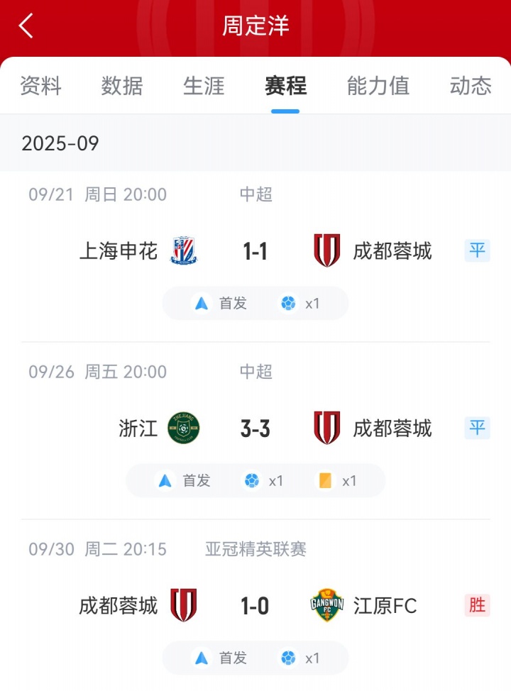 09月30日讯 亚冠精英联赛第2轮,蓉城1-0江原FC赢得队史亚冠正赛首胜。蓉城队长周定洋本场比赛打进一脚超逸的凌空抽射破门,这亦然全场比赛的独一进球。 至此,...