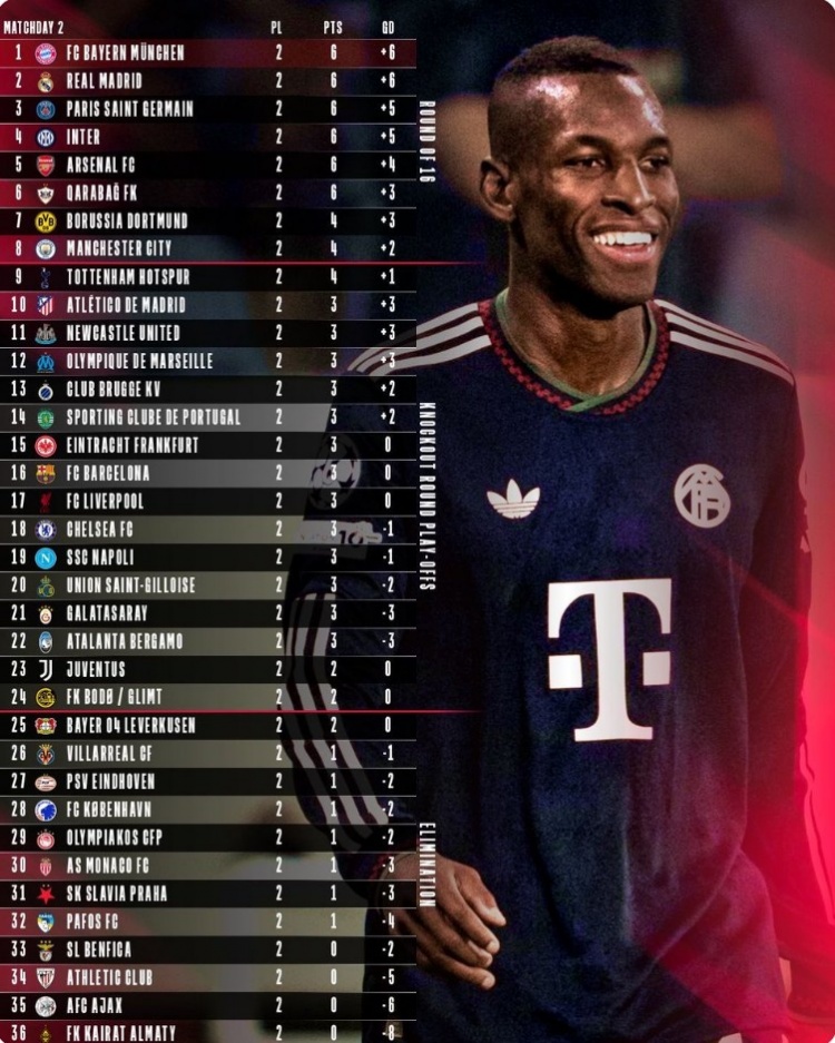 10月2日讯 本轮欧冠战罢,拜仁官推也晒出本赛季欧冠两轮之后的积分榜。 两战全胜的球队包括拜仁、皇马、巴黎、国米、阿森纳、卡拉巴赫,而拜仁与皇马同为6个净胜球,...