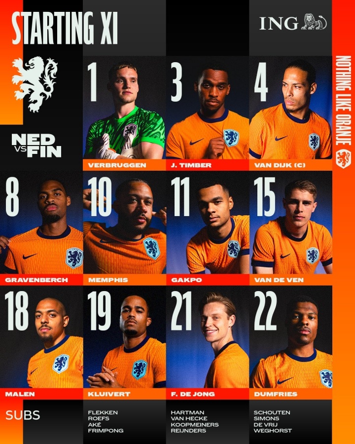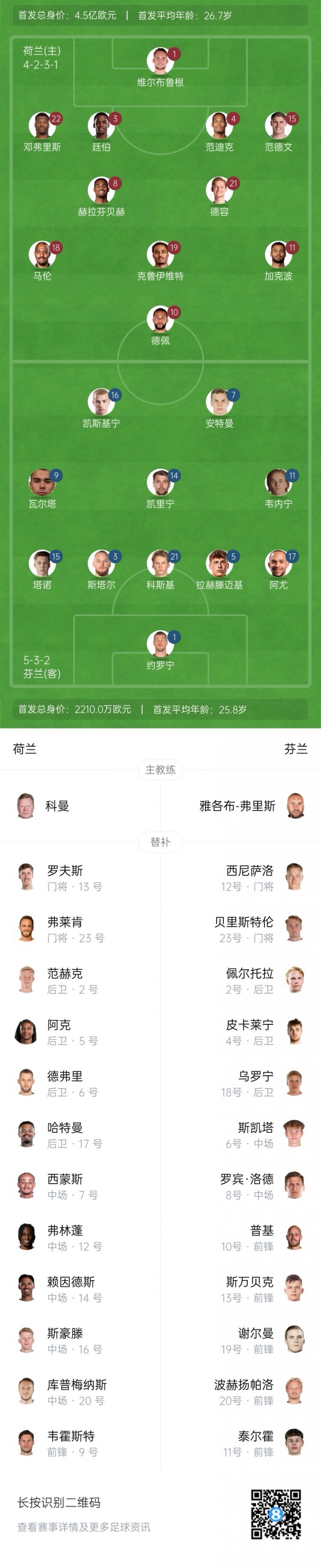 10月12日讯 世初赛欧洲区G组第8轮,荷兰主场迎战芬兰比赛行将打响。赛前首发出炉。 荷兰首发:1-维尔布鲁根、22-邓弗里斯、3-廷伯、4-范迪克、15-范德文、8-赫拉芬贝赫、21-德容、18-马伦、19-克鲁伊维特、11-加克波、10-德佩 荷兰替补:13-罗夫斯、25-弗莱肯、2-范赫克、5-阿克、6-德弗里、17-哈特曼、7-西蒙斯、12-弗林蓬、14-赖因德斯、16-斯豪滕、20-库普梅纳斯、9-韦霍斯特