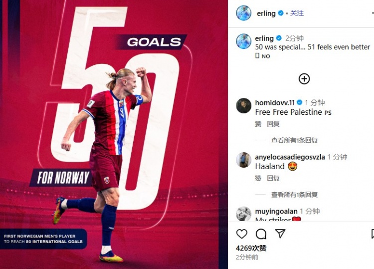 10月12日讯 本轮世初赛,挪威5-0大捷以色列,哈兰德戴帽,46场比赛杀青国度队50球里程碑。 哈兰德在社媒配文中写谈:“第50球很格外……但第51球的嗅觉会更好😉🇳🇴” |