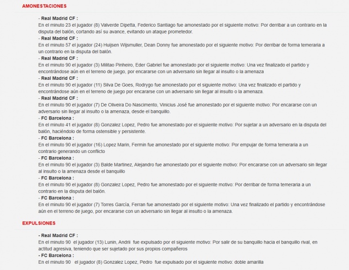10月27日讯 本轮西甲,皇家马德里2-1驯服巴塞罗那,赛后两队发生大限制冲破。 官方裁判敷陈中纪录了此次冲破的裁判判罚: 卢宁因作风激进地离开己方替补席走向对...