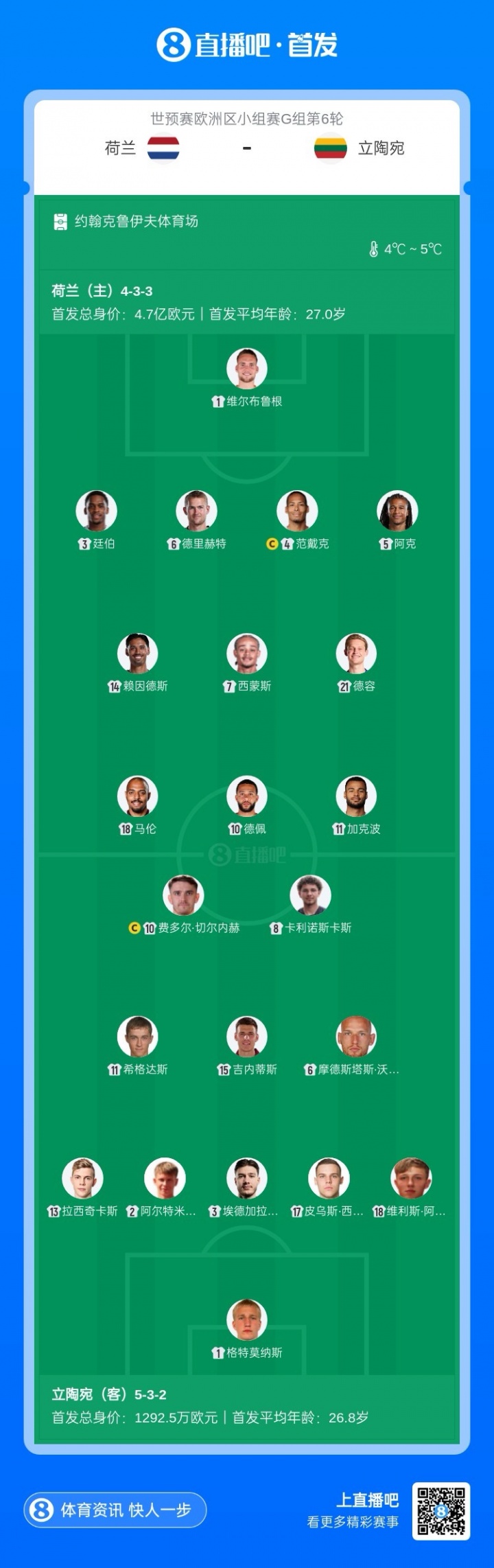 11月18日讯 世欧预G组第6轮,荷兰迎战立陶宛比赛行将打响。赛前首发出炉。本场赛前荷兰跨越第二名3分,并有13个净胜球上风。 荷兰首发:维尔布鲁根、3-廷伯、5-德里赫特、4-范戴克、5-阿克、14-赖因德斯、7-西蒙斯、21-德容、18-马伦、11-加克波、10-德佩 荷兰替补:15-范德芬、8-赫拉芬贝赫、2-海特勒伊达、23-弗莱肯、9-埃梅加、17-诺阿·朗、13-罗夫斯、16-斯豪腾、12-昆滕·廷伯、22-卢西亚诺·瓦伦特 立陶宛首发:1-格特莫纳斯、13-拉西奇卡斯、6-图蒂斯金纳斯、3-乌特库斯、17-西尔维斯、18-阿马拉斯、11-希格达斯、15-吉内蒂斯、6-摩德斯塔斯·沃罗查瓦斯、10-切尔内赫、8-卡利诺斯卡斯 立陶宛替补:14-米斯丘维斯、23-D·巴特库斯、19-乌普斯塔斯、12-斯韦德考斯卡斯、16-多曼塔斯·西姆库斯、9-保劳斯卡斯、4-奥尔贝基斯、20-莱基亚塔斯、22-古鲁比克卡斯、21-杜比卡斯、7-布尔巴、5-贝内塔