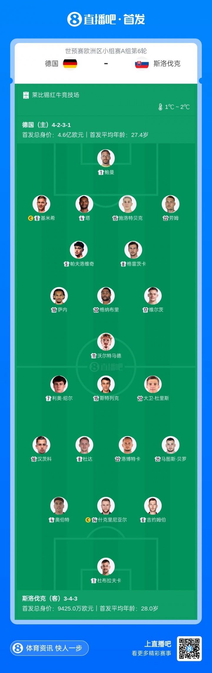11月18日讯 世欧预A组第6轮,德国迎战斯洛伐克比赛行将打响,赛前首发出炉。本场是A组前二的末轮凯旋对话,两队本场赛前同分,将争夺头名。 德国首发:1-鲍曼、6-基米希、4-若纳坦·塔、15-施洛特贝克、22-劳姆、5-帕夫洛维奇、8-格雷茨卡、19-萨内、20-格纳布里、17-维尔茨、11-沃尔特马德 德国替补:12-努贝尔、21-达门、2-佳夫、3-安东、18-N·布朗、23-巴库、7-勒威林、9-韦德拉奥果、13-恩梅查、16-沙德、10-伯卡特、14-阿德耶米 斯洛伐克首发:1-杜布拉夫卡、4-奥伯特、14-什克里尼亚尔、6-吉约姆伯、16-汉茨科、8-杜达、22-洛博特卡、21-马图斯·贝罗、7-利奥·绍尔、20-大卫·杜里斯、15-斯特列克 斯洛伐克替补:12-罗达克、23-多米尼克·达克斯、2-佩卡里克、3-瓦夫罗、5-萨特卡、19-里戈、10-贝奈什、13-赫鲁索夫斯基、9-博泽尼克、11-波切克、18-施兰茨、17-哈拉斯林
