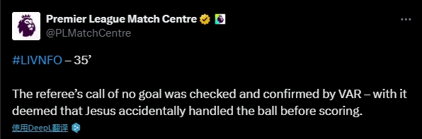11月22日讯 英超第12轮,利物浦vs诺丁汉丛林,比赛第35分钟,伊戈尔·热苏斯破门,但手球在先进球无效。 英超官方诠释这一判罚:裁判判罚进球无效,经由VAR裁判阐明,热苏斯进球前失慎用手触球。
