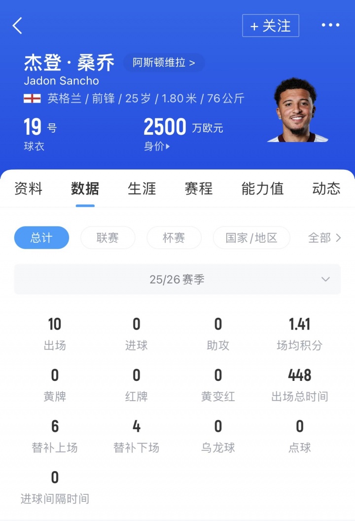 今夏租出维拉于今,25岁的桑乔各项赛事出场10次,0球0助处境莫名。此前据《邮报》的报谈,桑乔租出时候,维拉需承担其25万英镑周薪的80%(即20万镑)。