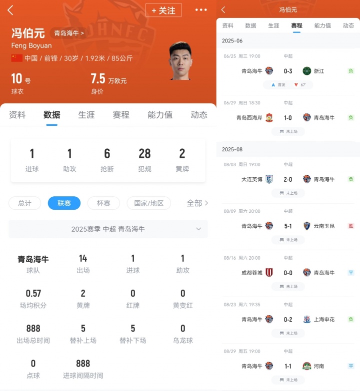 10月04日讯 “苏超”首场1/4淘汰赛,南京队点球大战礼服连云港队生效晋级,其中南京队派出了现效能于青岛海牛队的冯伯元首发出场。 比赛补时第92分钟,冯伯元送点,南京队被连云港点球绝平。点球大战中,冯伯元又罚丢点球,不外终末南京队点球大战一经生效礼服连云港,晋级四强。 冯伯元补时送点被绝平↓ 冯伯元点球被扑↓ 冯伯元现在效能于中超青岛海牛队,身穿海牛10号球衣。本赛季,冯伯元为海牛在中超出战14场比赛,孝顺1球1助攻。近几轮中超联赛中,冯伯元均未代表海牛登场。 |