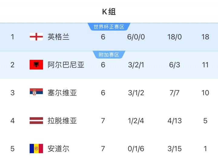 10月15日讯 世初赛欧洲区小组赛K组第8轮,英格兰客场5-0大捷拉脱维亚,世初赛6轮全胜狂轰18球且0失球,锁定小组头名,提前2轮锁定2026宇宙杯!