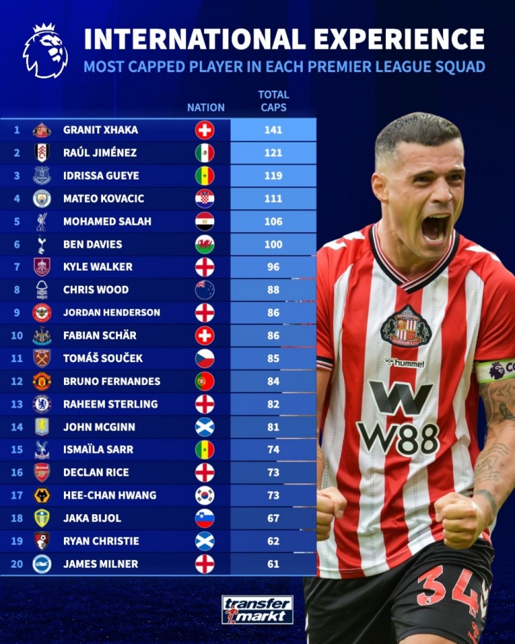 11月1日讯 英超20支球队有着诸多国脚球员,德国转会商场清点了各队为国度队出战场次最多球员,扎卡以141场居首,希门尼斯以121场位居次席。 以下为具体名次情况: 1、扎卡(瑞士,桑德兰):141场 2、希门尼斯(墨西哥,富勒姆):121场 3、盖耶(塞内加尔,埃弗顿):119场 4、科瓦契奇(克罗地亚,曼城):111场 5、萨拉赫(埃及,利物浦):106场 6、本-戴维斯(威尔士,热刺):100场 7、凯尔-沃克(英格兰,伯恩利):96场 8、克里斯-伍德(新西兰,诺丁汉丛林):88场 9、亨德森(英格兰,布伦特福德):86场 10、沙尔(瑞士,纽卡):86场 11、绍切克(捷克,西汉姆联):85场 12、布鲁诺-费尔南德斯(葡萄牙,曼联):84场 13、斯特林(英格兰,切尔西):82场 14、麦金(苏格兰,维拉):81场 15、伊斯梅拉-萨尔(塞内加尔,水晶宫):74场 16、赖斯(英格兰,阿森纳):73场 17、黄喜灿(韩国,狼队):73场 18、比约尔(斯洛文尼亚,利兹联):67场 19、克里斯蒂(苏格兰,伯恩茅斯):62场 20、米尔纳(英格兰,布莱顿):61场 |