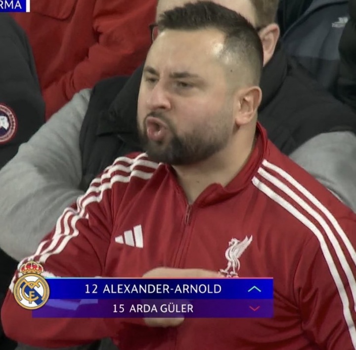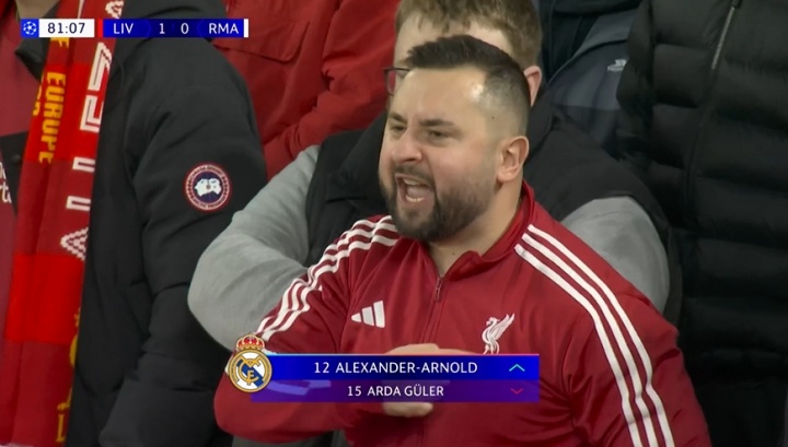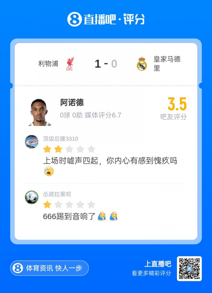 11月05日讯 欧冠第4轮,利物浦主场1-0驯服皇马。 比赛第82分钟,利物浦青训建立,遵守赤军多年的阿诺德替补登场,换下居莱尔。 登场时,阿诺德遭到了赤军球迷的“浓烈宽贷”:安菲尔德嘘声四起,镜头给到的一位球迷向他手指着胸前的利物浦队徽,口中想有词,随后这位球迷还俯首亲吻了队徽。 阿诺德的上场并未改换比赛的走势,最终皇马客场0-1落败。